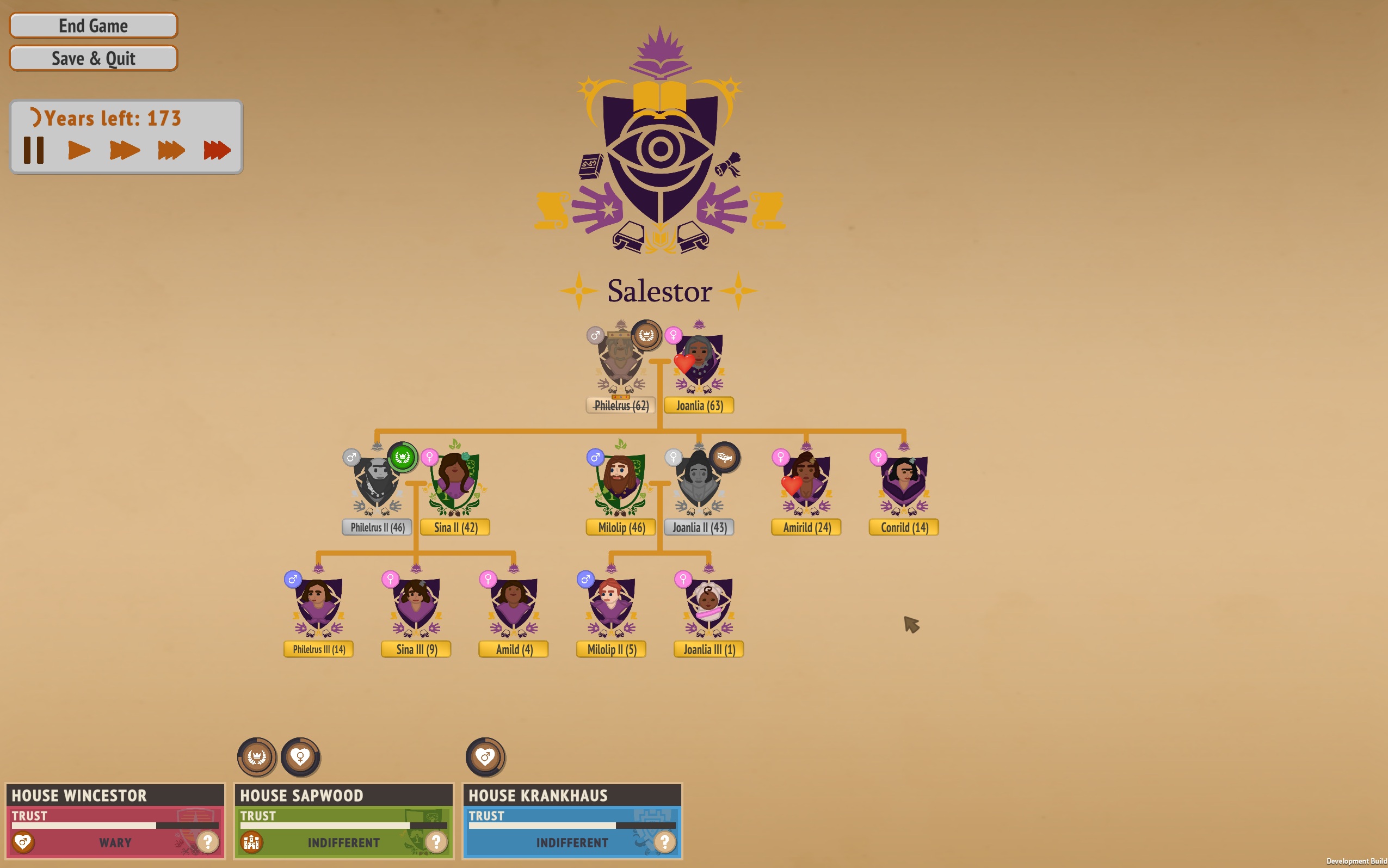 through the family tree of one of the four Noble Houses. Marry your nobles with the other houses. Survive for centuries and generations. Grow your family.